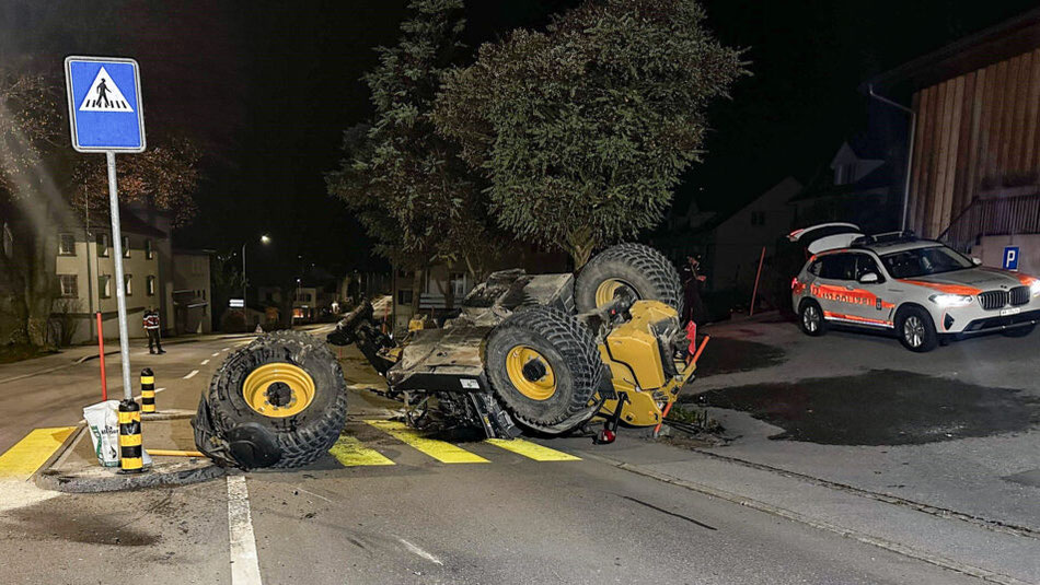 Kurz vor 21 Uhr lenkte ein 49-Jähriger sein Arbeitsfahrzeug vom Stooss herkommend durch das Dorf Gais. Im Bereich der Liegenschaft Riesen 1 geriet der Mann mit dem Frontanbauteil des Fahrzeuges gegen die Fussgängerinsel in der Mitte der Strasse. Durch die Wucht überschlug sich der Teleskoplader und kam auf der Seite liegend zum Stillstand.